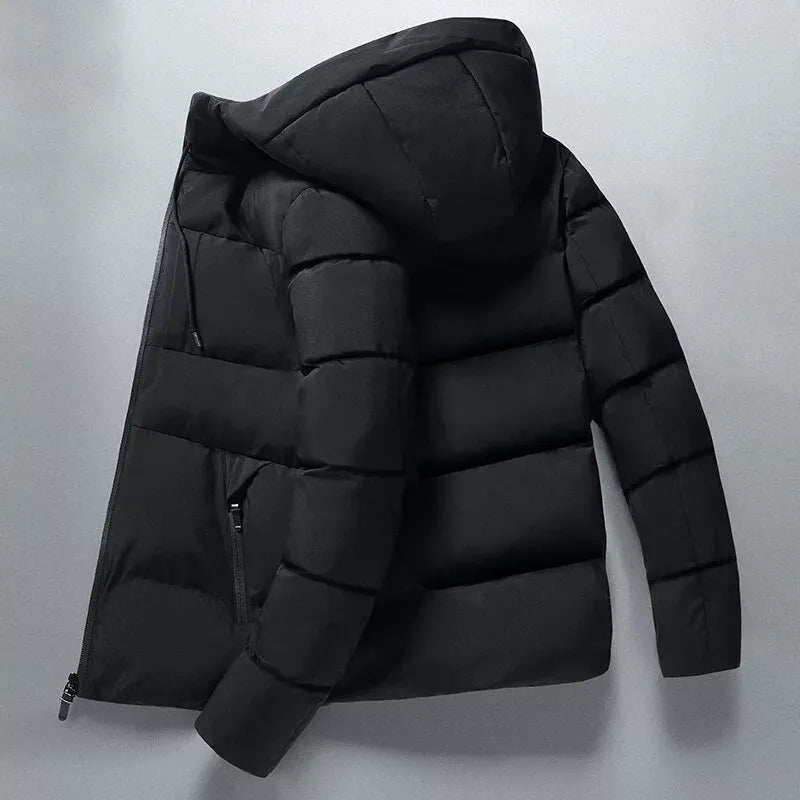 Quilted Slim Fit Padded Hooded Jacket by Couture-Moda. This stylish men's hooded jacket offers warmth and a modern silhouette. Featuring cotton padding for insulation, a quilted design, and a slim fit, it's the perfect casual outerwear for cooler days. Zippered pockets offer secure storage.