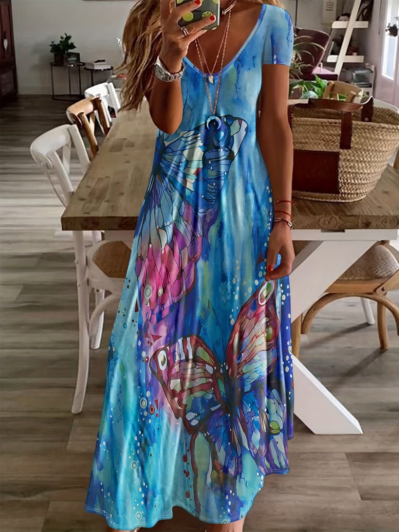 Embrace effortless style with the Couture-Moda Women's Maxi Dress - Sleeveless V-Neck - Flowing Fit - Bold Butterfly Print. This lightweight dress boasts a flattering V-neck and a vibrant butterfly design, perfect for warm weather and versatile styling.