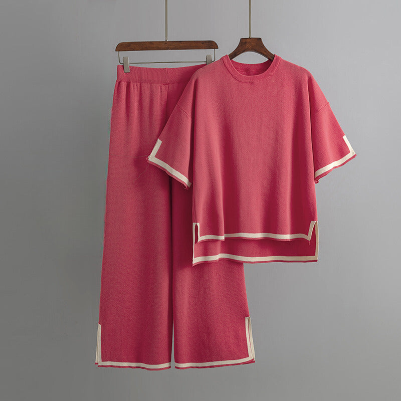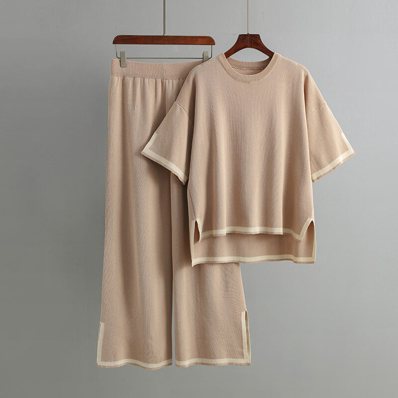This women's loungewear set consists of a relaxed fit T-shirt paired with flowing wide-leg pants, blending refinement with ultimate comfort. The soft fabric and graceful design make it perfect for lounging at home or casual outings. Elevate your relaxation moments with this chic and versatile set.