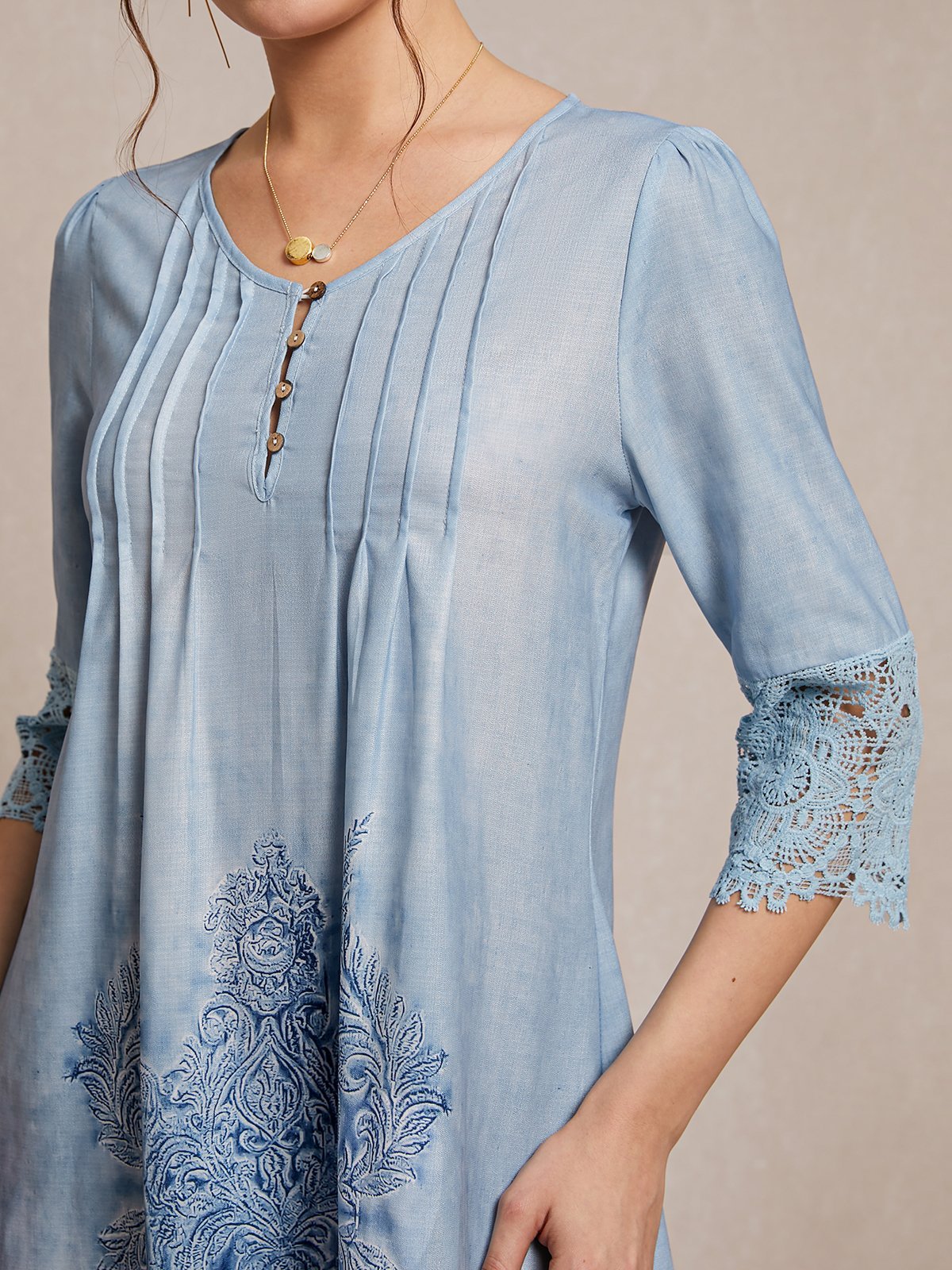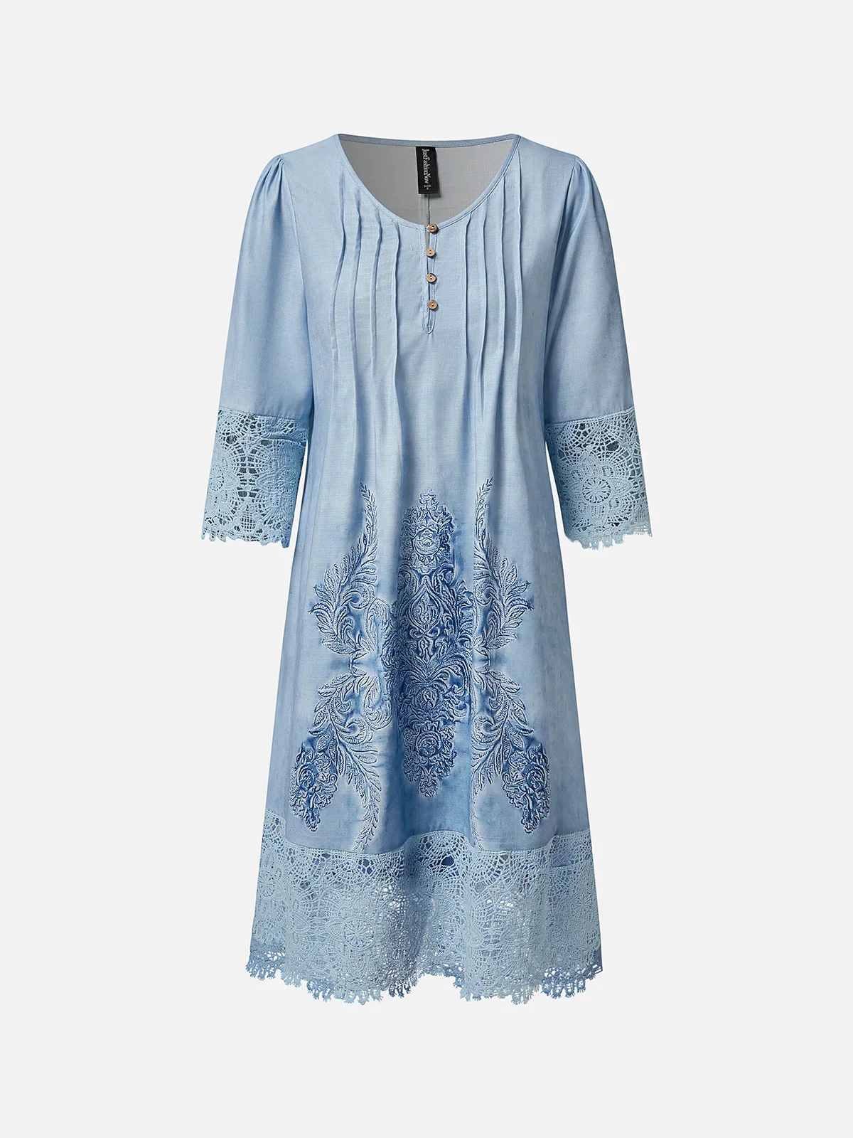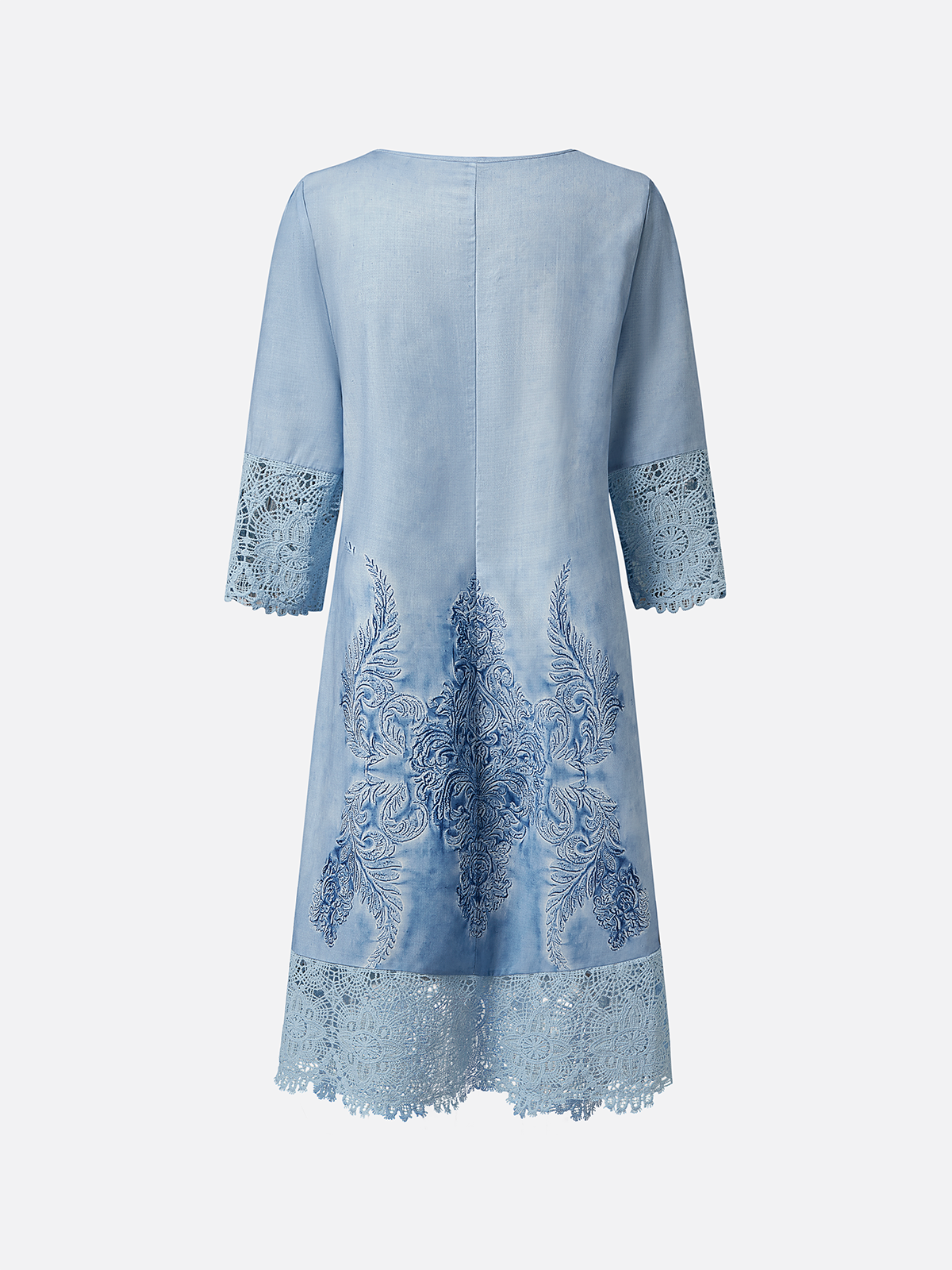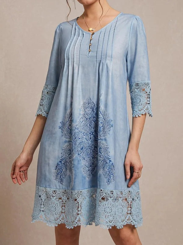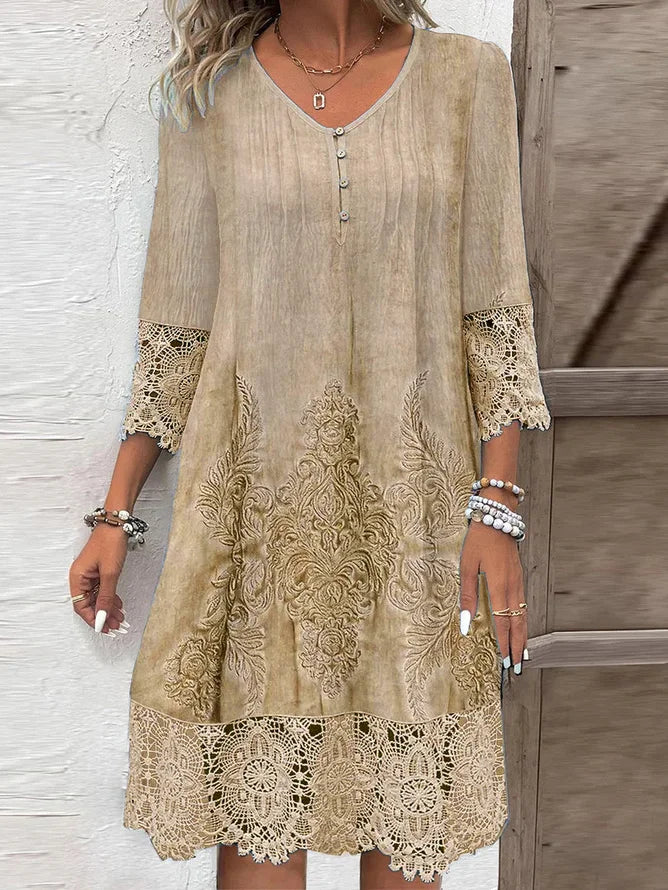 Discover timeless elegance in this Women's Knee-Length Lace & Embroidery Dress. Featuring three-quarter sleeves, a flattering V-neck, and delicate button-up design, this dress from Couture-Moda offers sophistication and comfort for any occasion.