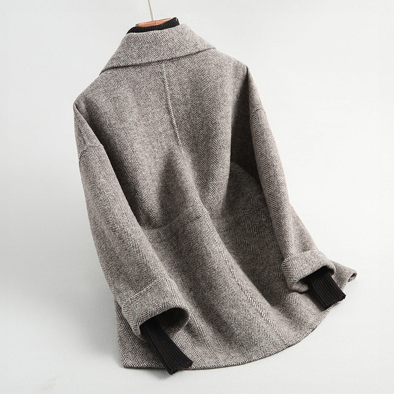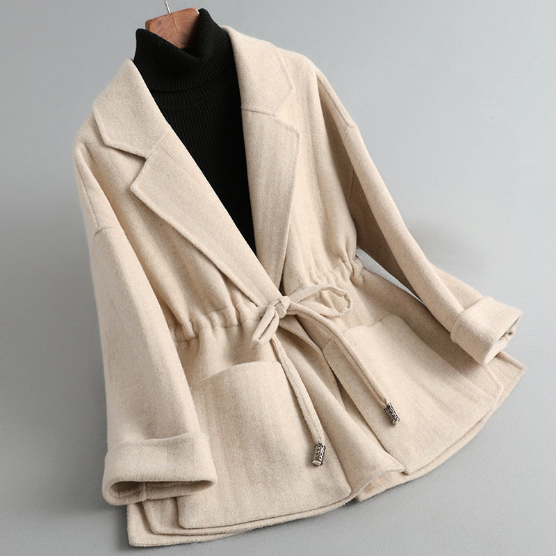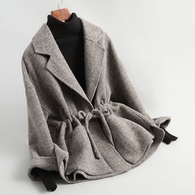 This women's jacket features a stylish reefer collar and a practical drawstring waist, allowing you to customize your fit for maximum comfort. Made from high-quality, durable fabric, this jacket is perfect for layering during cooler months. Its sleek design makes it a versatile choice for casual outings or a polished look over your favorite dress.