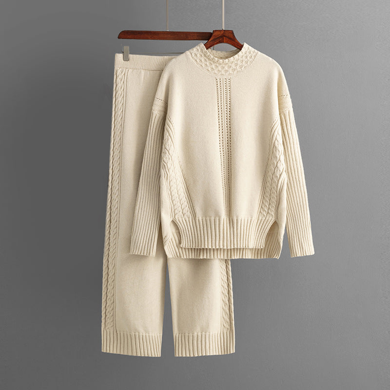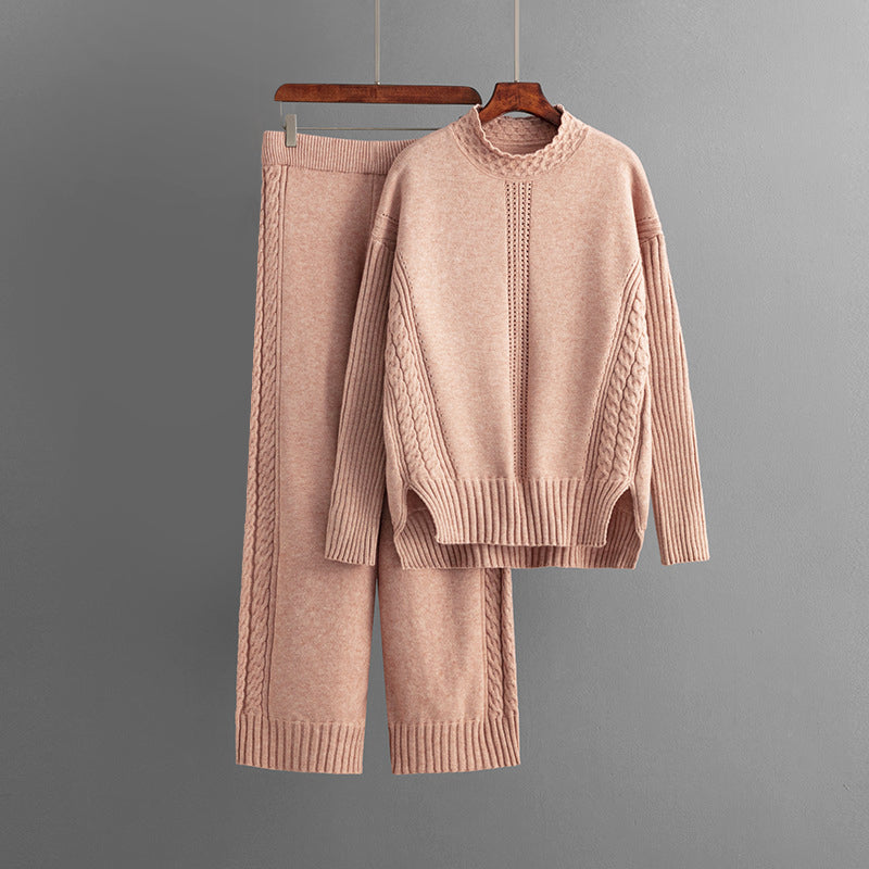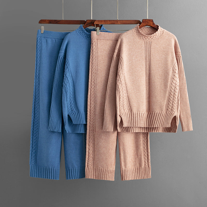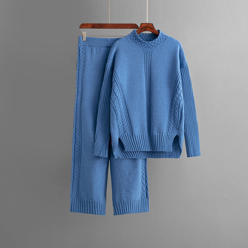 This knitted sweater and wide-leg pant combination embodies both comfort and style. The high collar adds a touch of sophistication, making it perfect for lounging at home or catching up with friends over coffee.