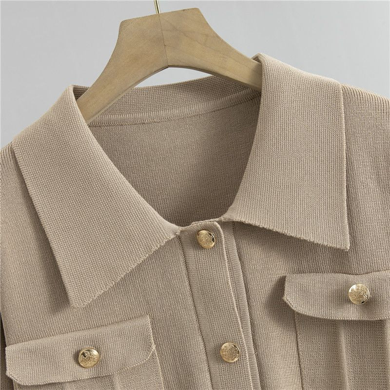 Women's Knit Two-Piece Set - Button-Up Cardigan & High-Waisted Midi Skirt. This chic knitted set features a button-up cardigan with chest pockets and a high-waisted midi skirt. Perfect for creating effortless, stylish looks.