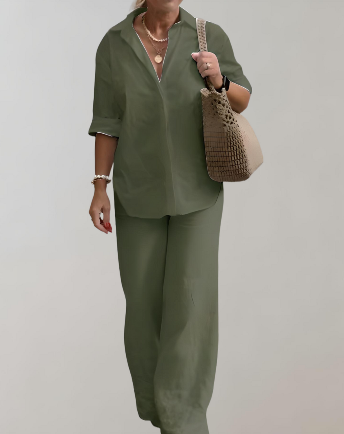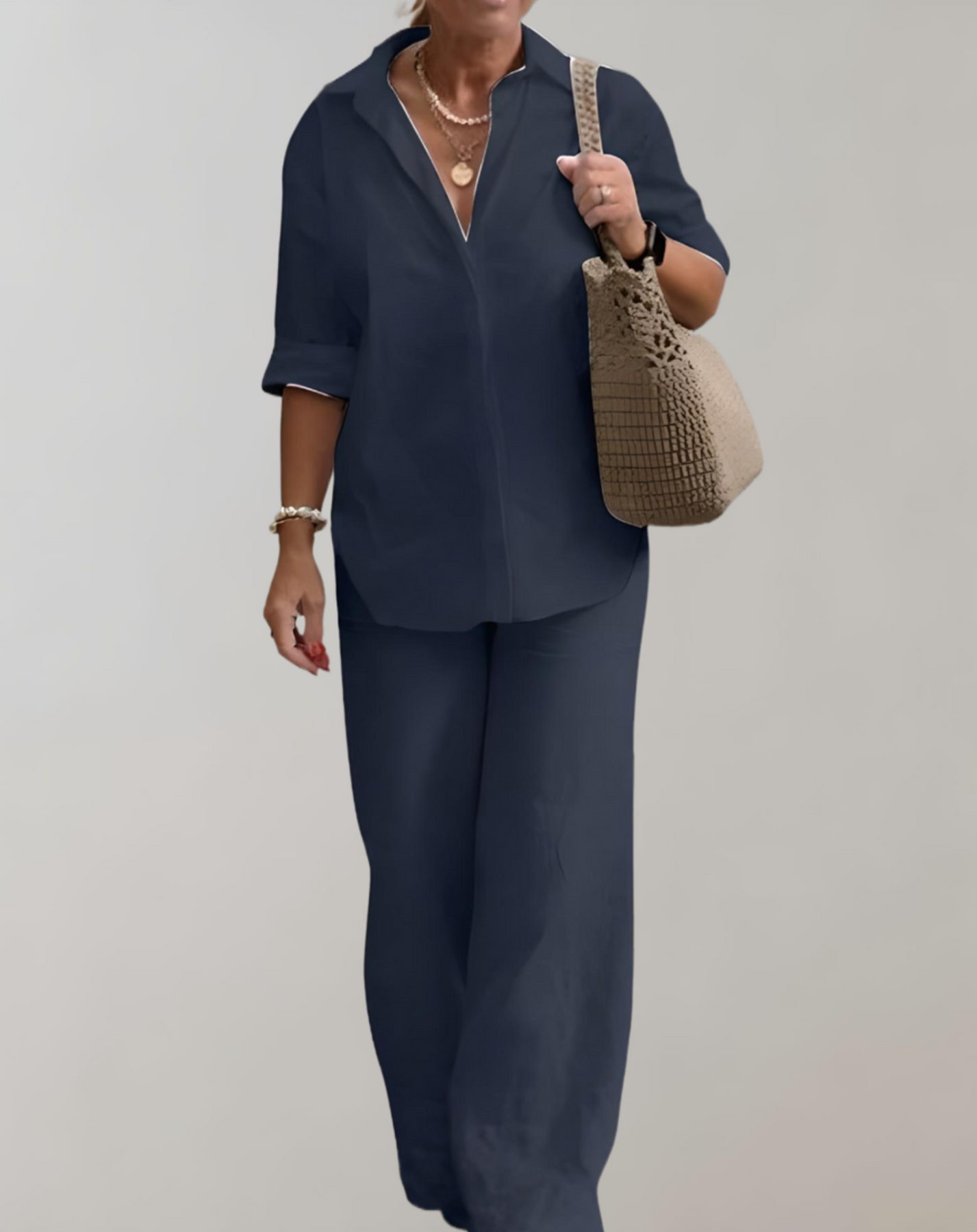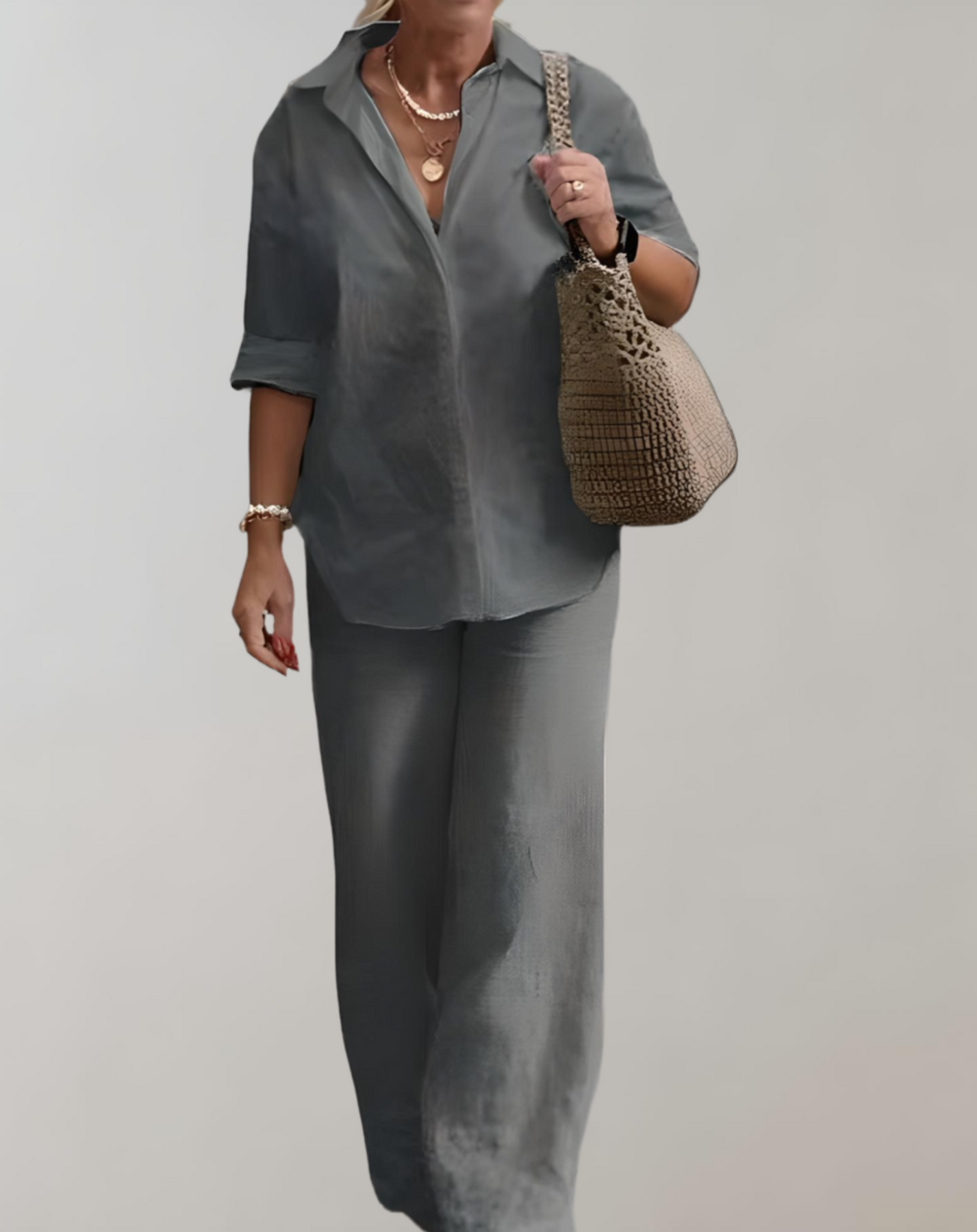 Women's Two-Piece Trouser Suit – Button-Up Shirt – Wide-Leg Trousers – Relaxed Fit. Discover effortless style with this chic co-ord set. This relaxed fit button-up shirt and wide-leg trousers offer comfort and sophistication for any occasion. Perfect for creating a modern, casual, or semi-formal look.