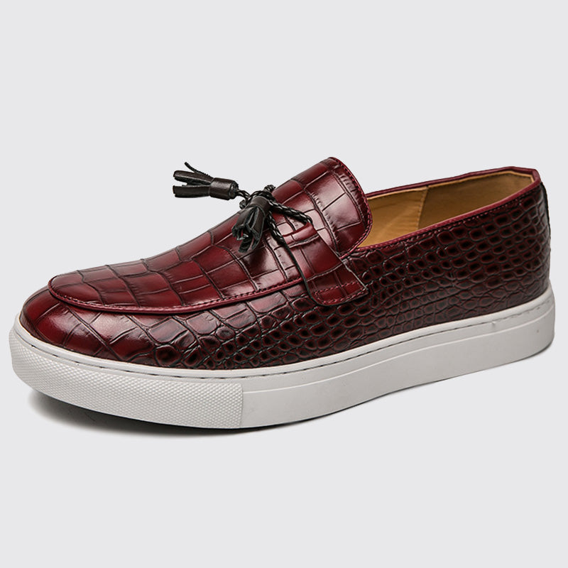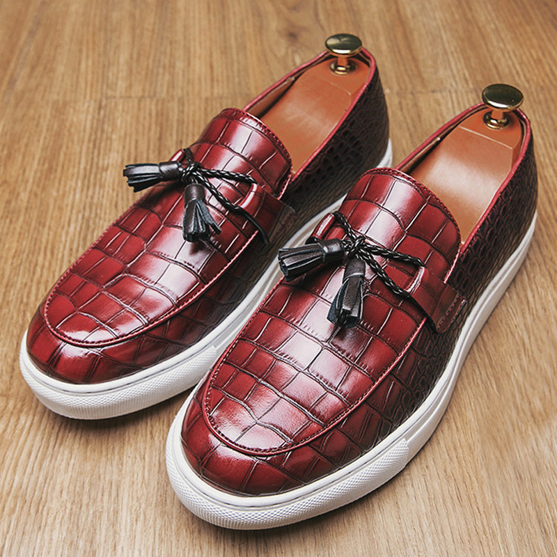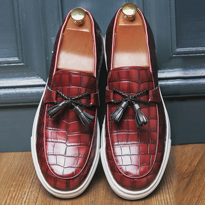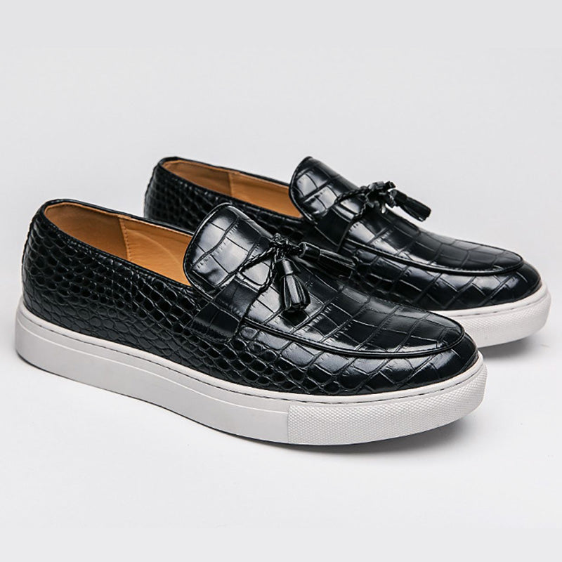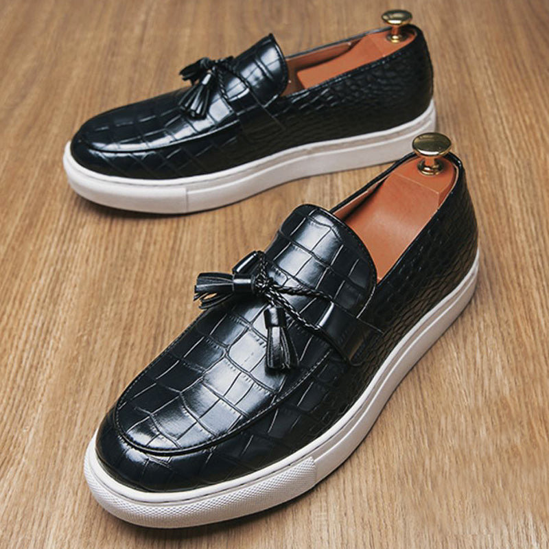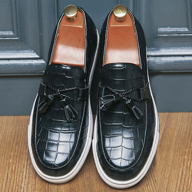 Men’s Leather Loafers – Embossed Croc Pattern – Tassel Detail – Slip-On Formal Shoes. Step into sophisticated style with these embossed croc pattern loafers. Featuring a classic slip-on design with tassel detailing, these formal shoes offer a blend of comfort and elegance, perfect for any discerning gentleman.