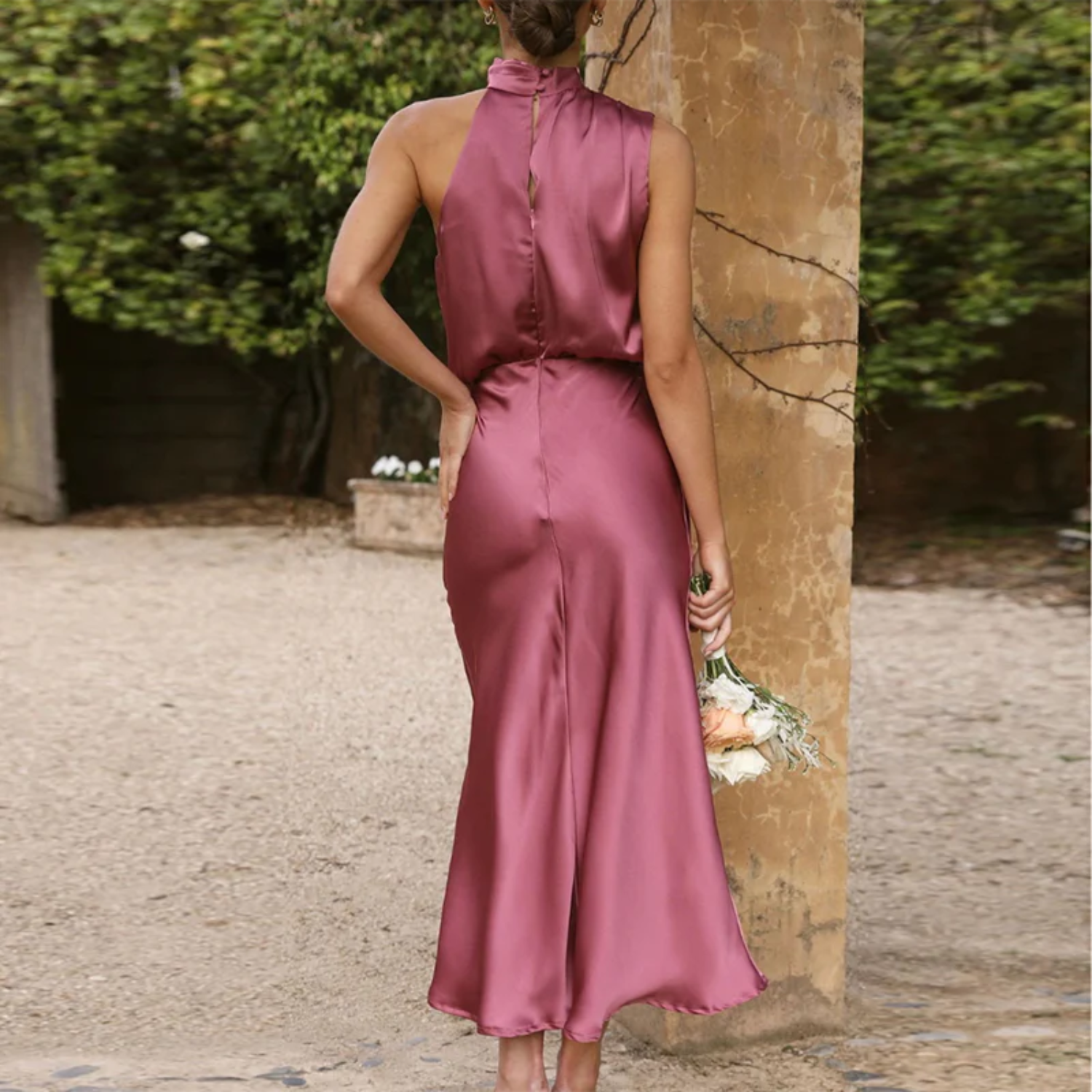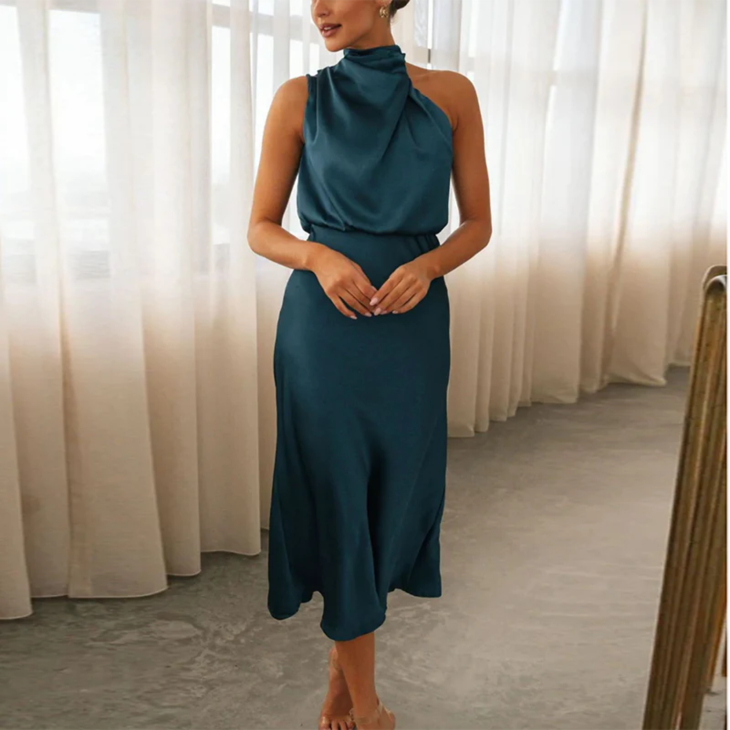Embrace timeless elegance with the Women's Satin Gown - One Shoulder Draped Neckline - Fitted Waist - Elegant Formal Wear by Emporium-Allure. This sleeveless satin gown features a sophisticated one-shoulder design and figure-flattering fitted waist. Perfect for creating a refined silhouette at any formal event.