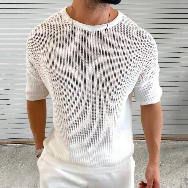 Men’s Knit Top – Slim Fit – Lightweight Semi-Sheer – Ribbed Texture – Crew Neck – Short Sleeve by Couture-Moda. This slim-fit, lightweight knit top features a modern semi-sheer ribbed texture and classic crew neck. Perfect for a stylish, comfortable look.