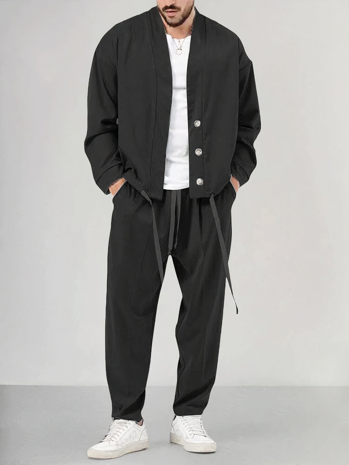 Men’s Kimono Jacket & Trousers Set – Lightweight Breathable Fabric – Relaxed Fit. Elevate your wardrobe with this stylish & comfortable set. The relaxed fit jacket and trousers are made from lightweight, breathable fabric ideal for casual wear. Features include an open-front jacket and elasticated waist trousers.