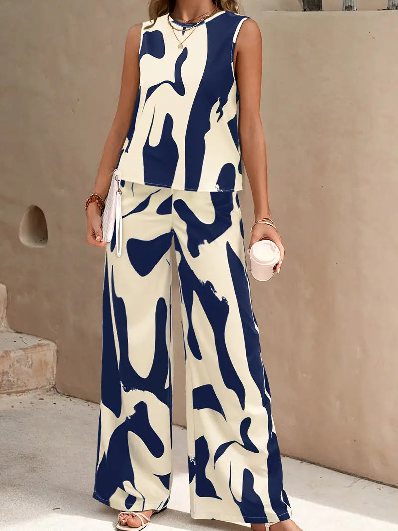 Women’s 2-Piece Set – Sleeveless Top & Wide-Leg Trousers – Relaxed Fit – Breathable Blend. This stylish women's set features a comfortable sleeveless top and flowy wide-leg trousers. The breathable blend and relaxed fit make it perfect for warm weather and casual outings. A bold, abstract print adds a modern touch.