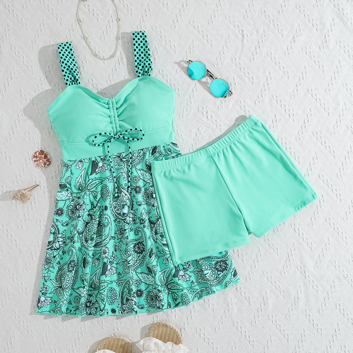 Elevate your beach look with strappy sandals and oversized sunglasses. Add a wide-brimmed hat for extra sun protection and a touch of glamour.