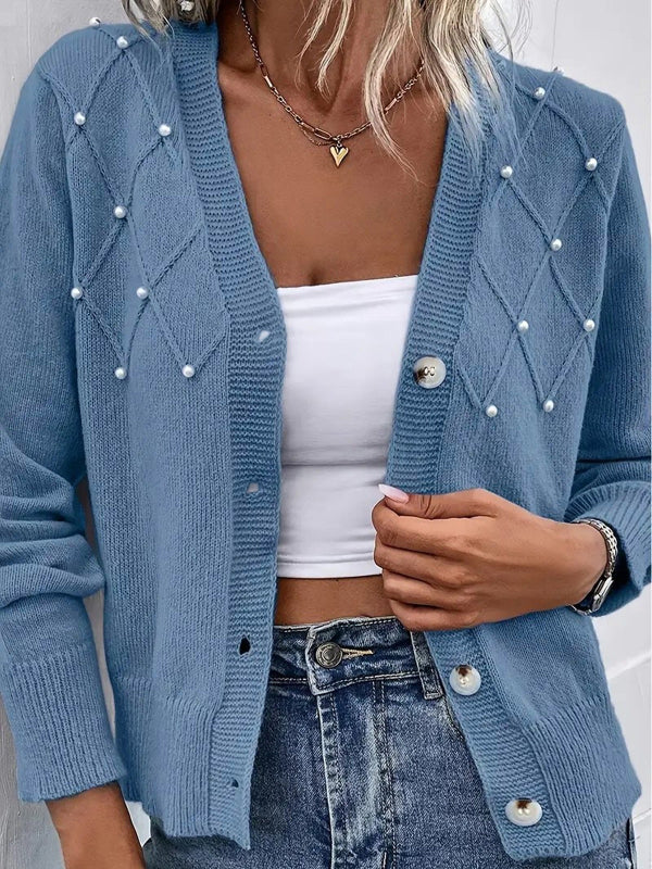 Discover timeless elegance with the Couture-Moda Wool Knit Relaxed Fit Cardigan. This V-neck cardigan features a button-front closure and delicate pearl embellishments, crafted from soft wool knit for ultimate comfort and style. Perfect for layering, this versatile piece elevates any outfit.