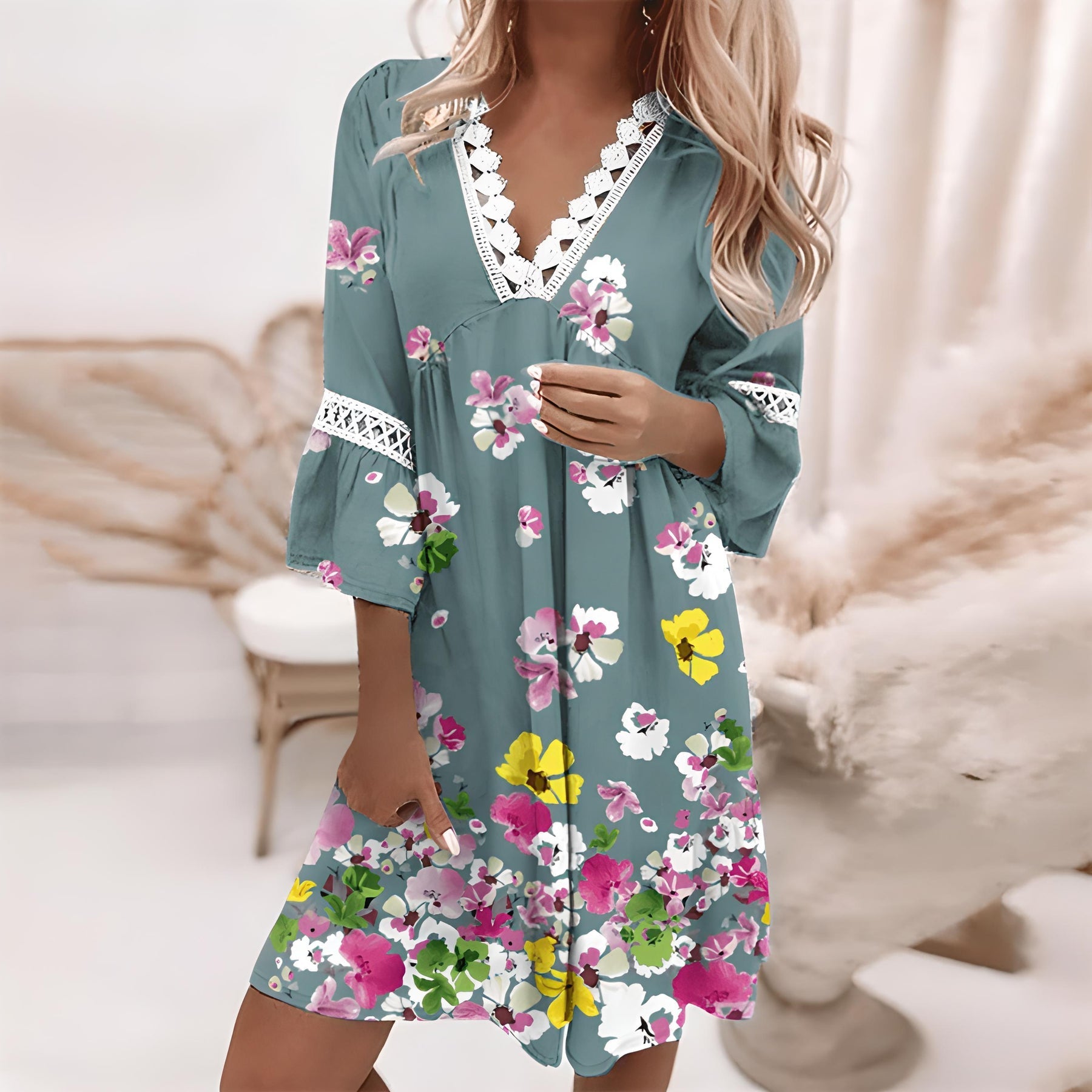 Women’s Mini Dress – Relaxed Fit – V-Neck Lace Detail – Flared 3/4 Sleeves – Flowing Fabric. This relaxed fit dress features delicate V-neck lace and flared sleeves, perfect for warm weather. The flowing fabric ensures a comfortable, elegant look for casual outings or beach events.