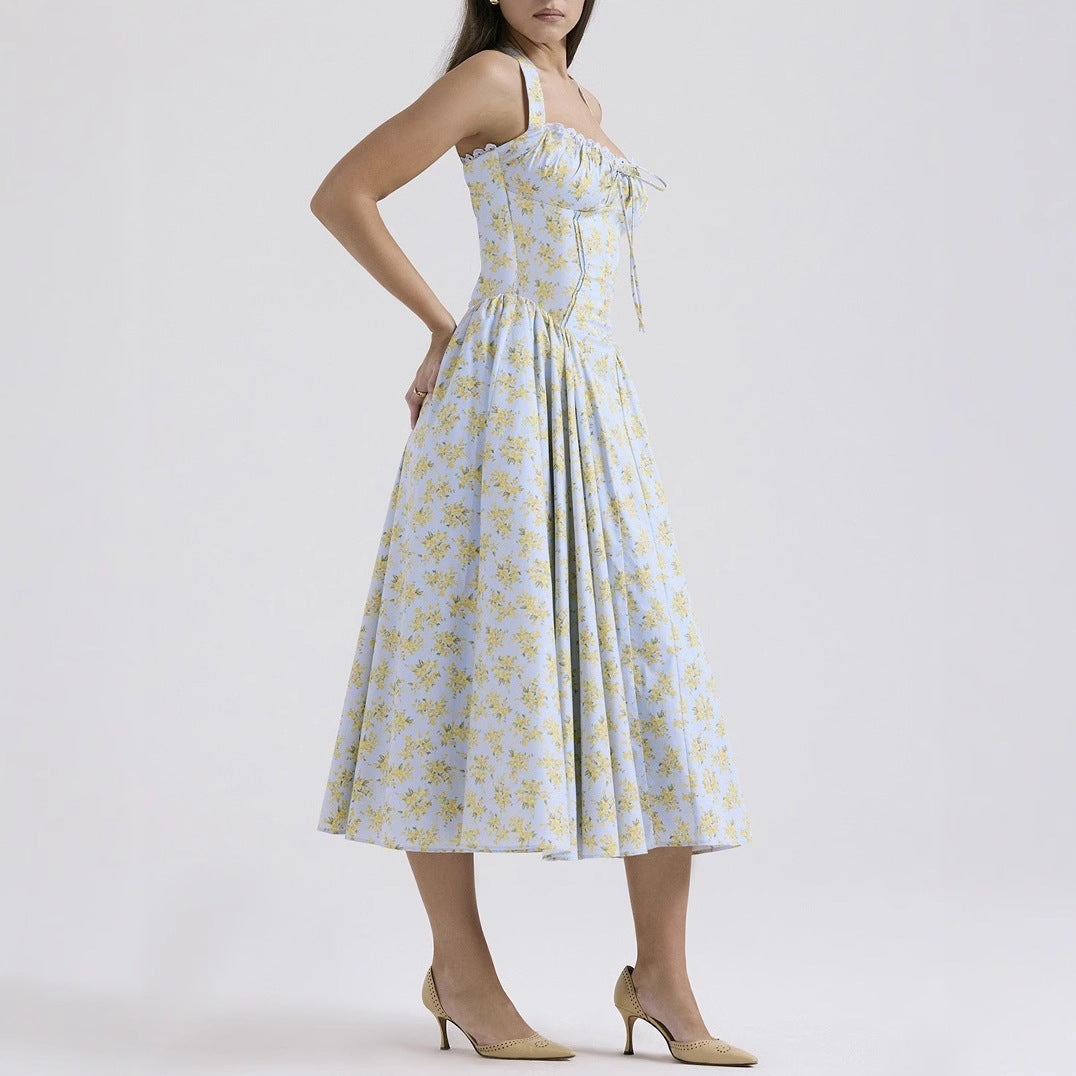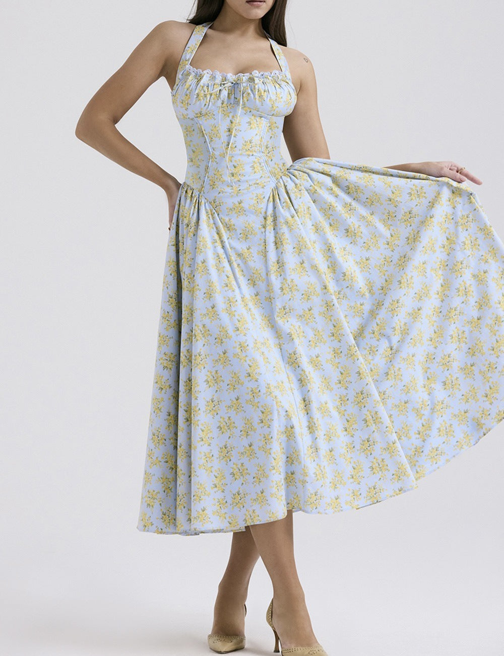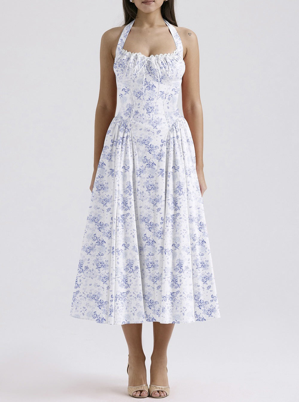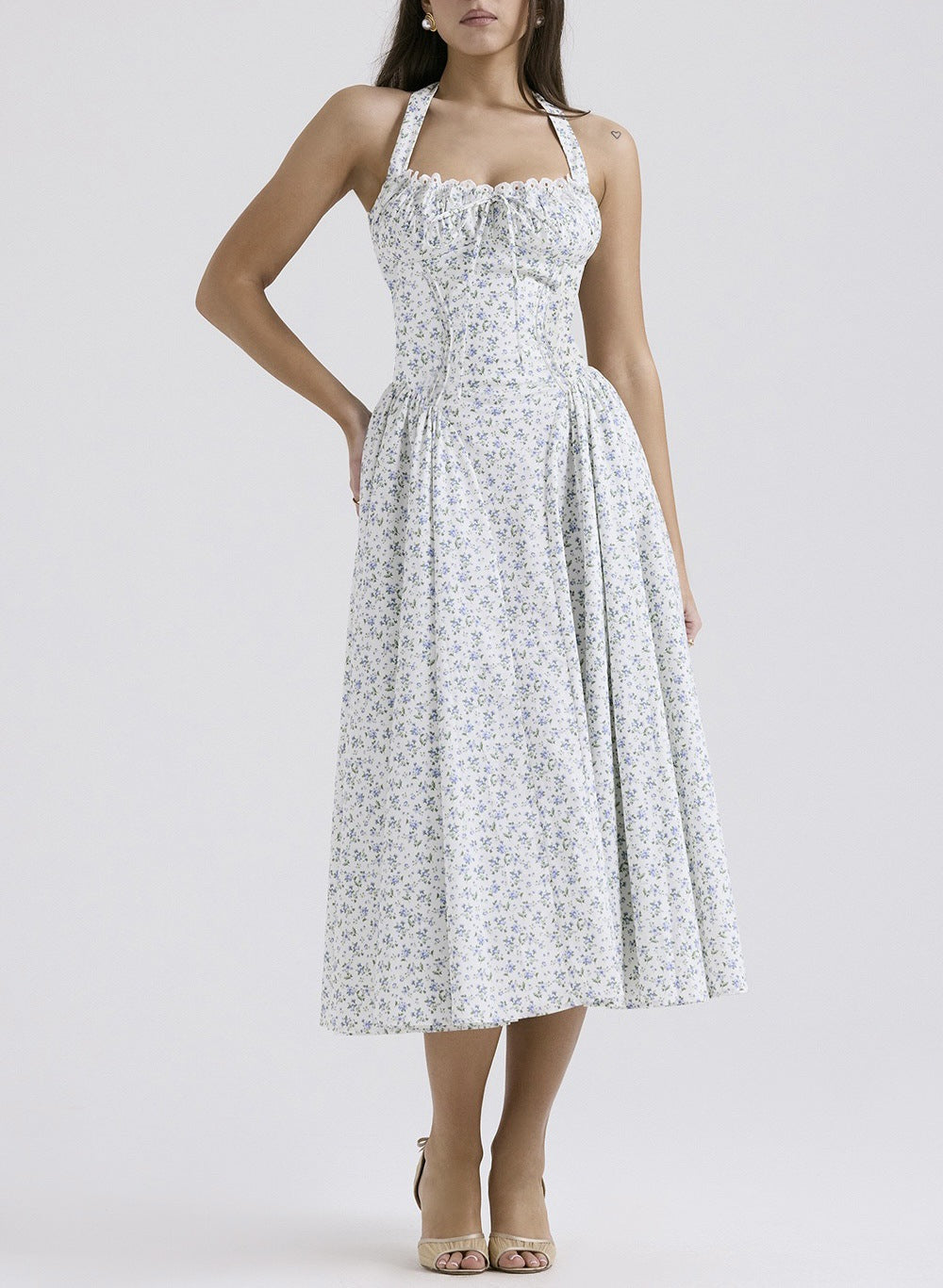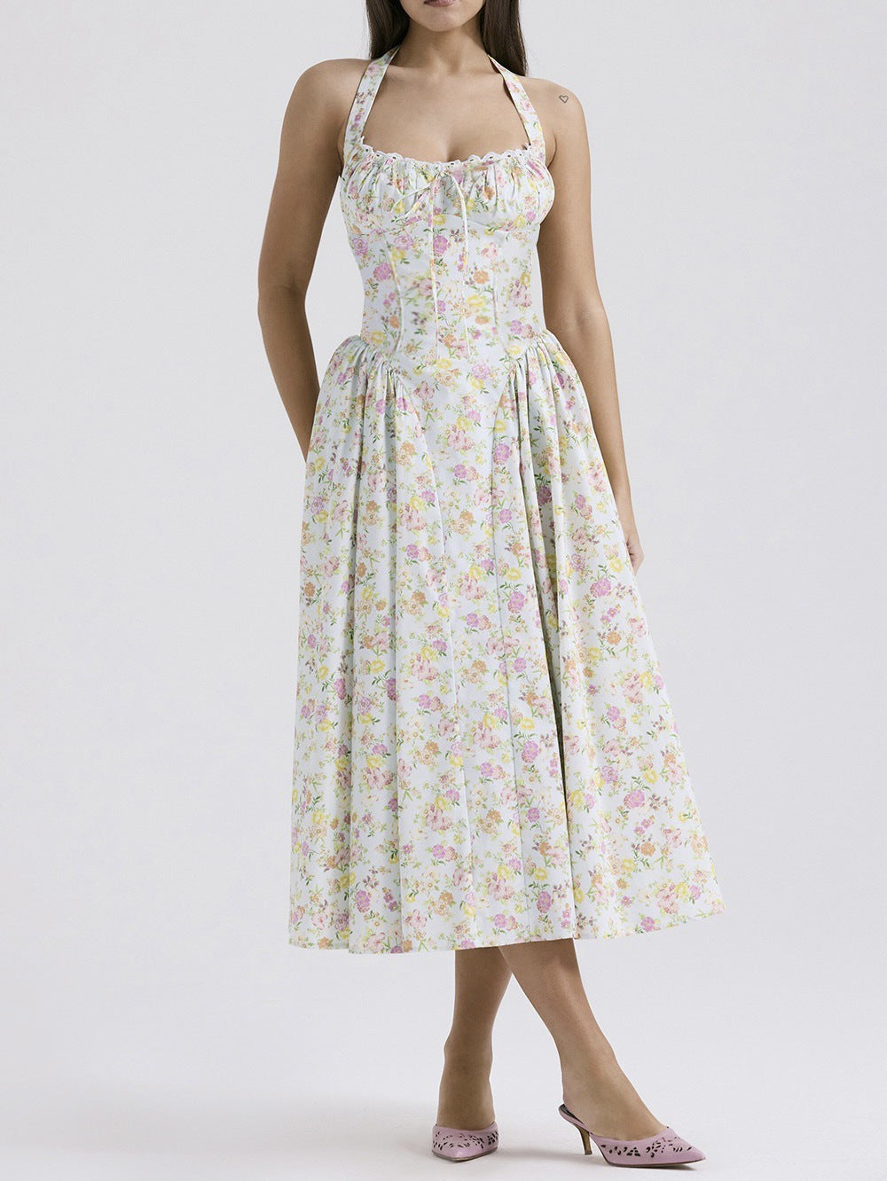 - Design: Backless, Gathered Bodice, Flared Skirt