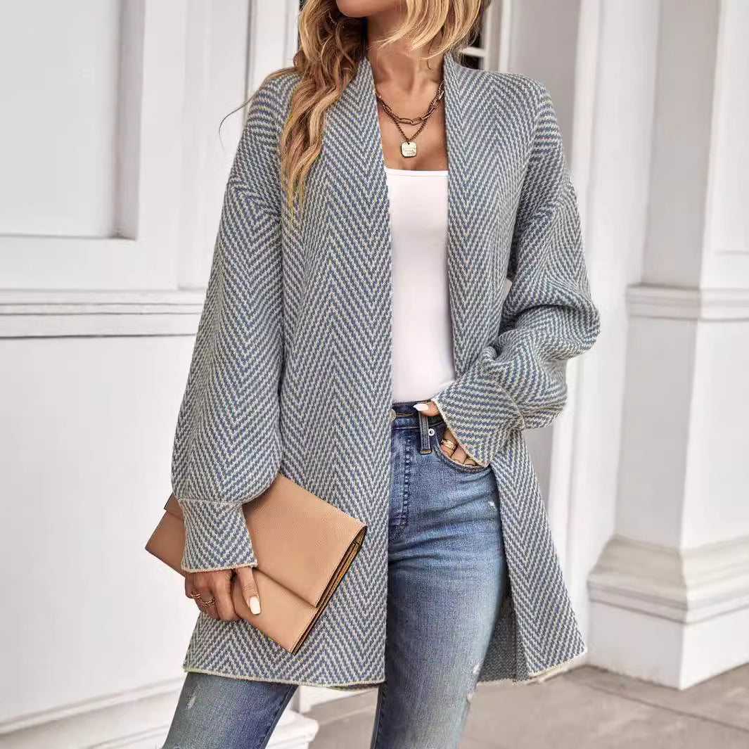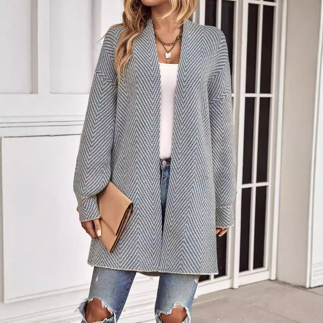 - Design: Relaxed Fit, Open Front, Herringbone Pattern