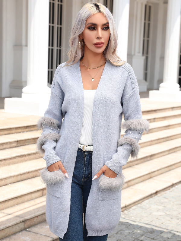 Wrap yourself in luxury with the Couture-Moda Pearl Sleeve Relaxed Fit Knit Cardigan. This open-front cardigan features a flattering V-neck, elegant pearl sleeve details, and a touch of glamour with its faux fur trim. Perfect for adding a sophisticated layer to any outfit, combining comfort and style.