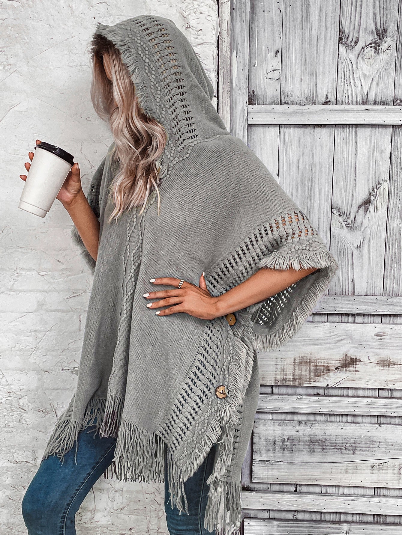 Knitted Wool Blend Oversized Fit Poncho. Stay cozy and stylish in Couture-Moda's hooded poncho. This women's wool blend poncho features a V-neck, fringed hem, and oversized fit, making it perfect for layering.