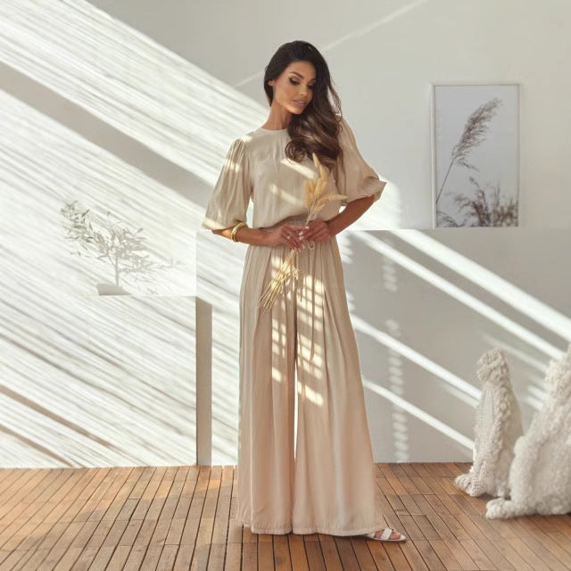Effortless style meets ultimate comfort with Couture-Moda's Women's Two-Piece Set – Loose Fit T-Shirt with Back Bow and Wide-Leg Pocket Trousers. This relaxed fit set features a playful back bow detail on the tee and practical pockets on the flowy, wide-leg pants. Perfect for casual days!