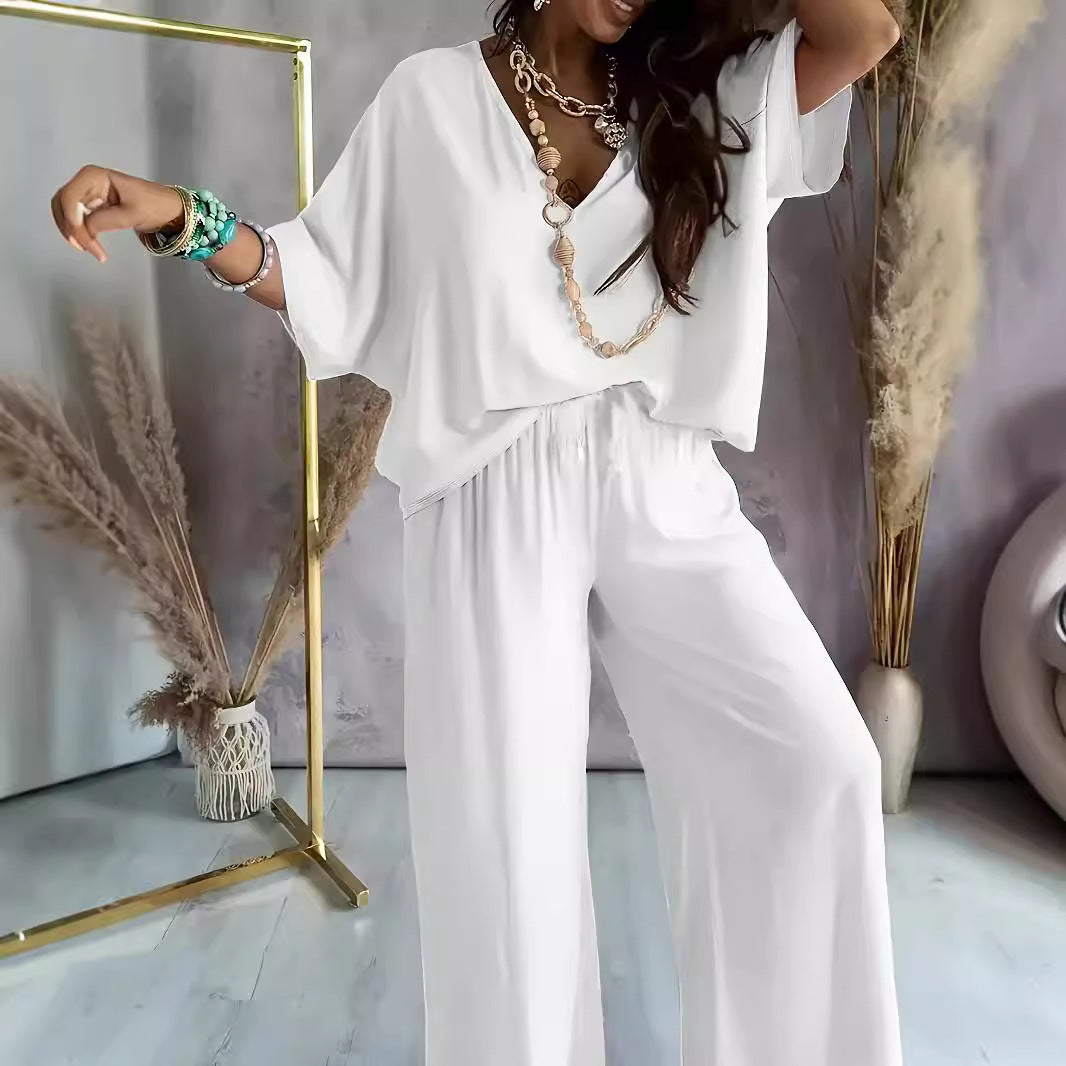Women’s Two-Piece Set – Relaxed Fit – V-Neck Top – Wide-Leg Trousers – Breathable Blend by Couture-Moda. This set offers effortless style and comfort with its relaxed fit, V-neck top, and flowing wide-leg trousers. Perfect for casual outings or relaxed days, this breathable blend provides all-day ease and chic sophistication.