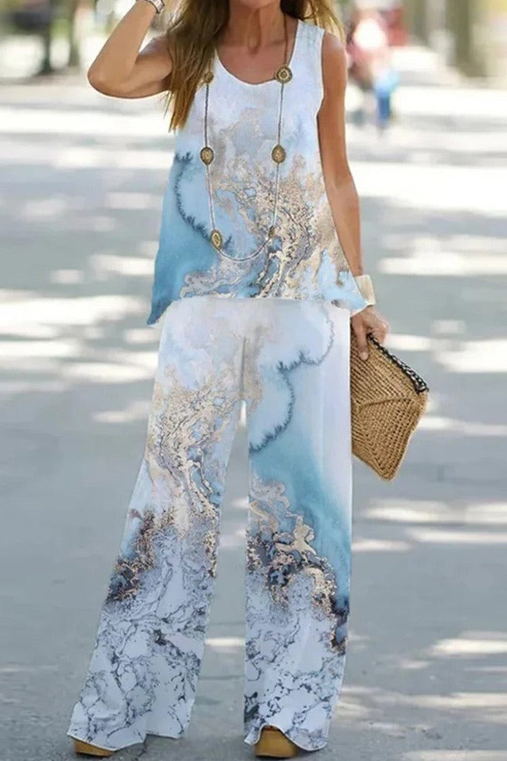 Women’s Two-Piece Set – Sleeveless Top – Wide-Leg Trousers – Relaxed Fit – Breathable Fabric. Experience ultimate comfort and style with this relaxed-fit two-piece set featuring a sleeveless top and wide-leg trousers. Crafted from a breathable material blend with a artistic swirling pattern, this set is perfect for warm weather and casual occasions.