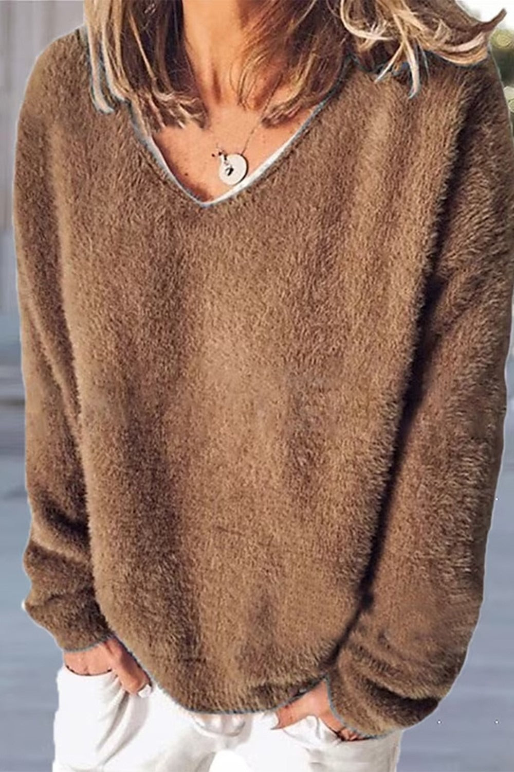 Fuzzy Knit Relaxed Fit V-Neck Sweatshirt is the perfect blend of comfort and style. This cozy, long-sleeve sweatshirt features a flattering V-neck and a relaxed fit, all in a soft, fuzzy knit. Ideal for casual days and relaxed outings.