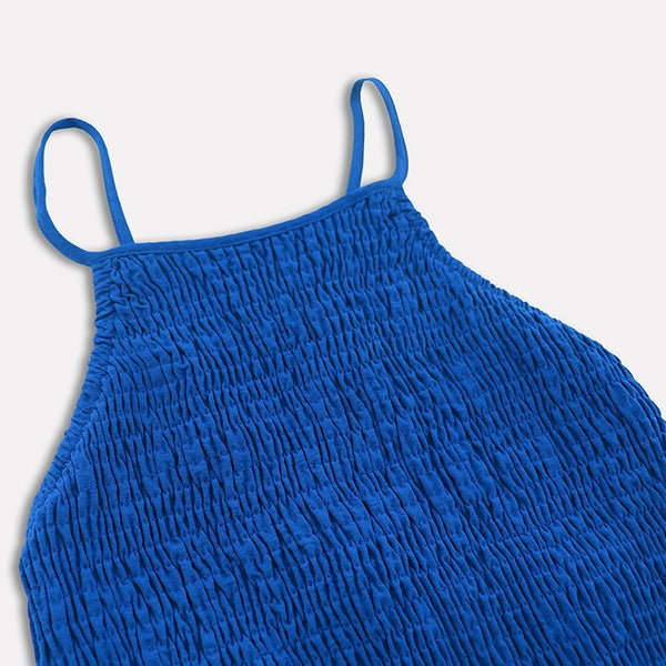 - Design: Halter neck maxi dress with smocked bodice and ruffle hem